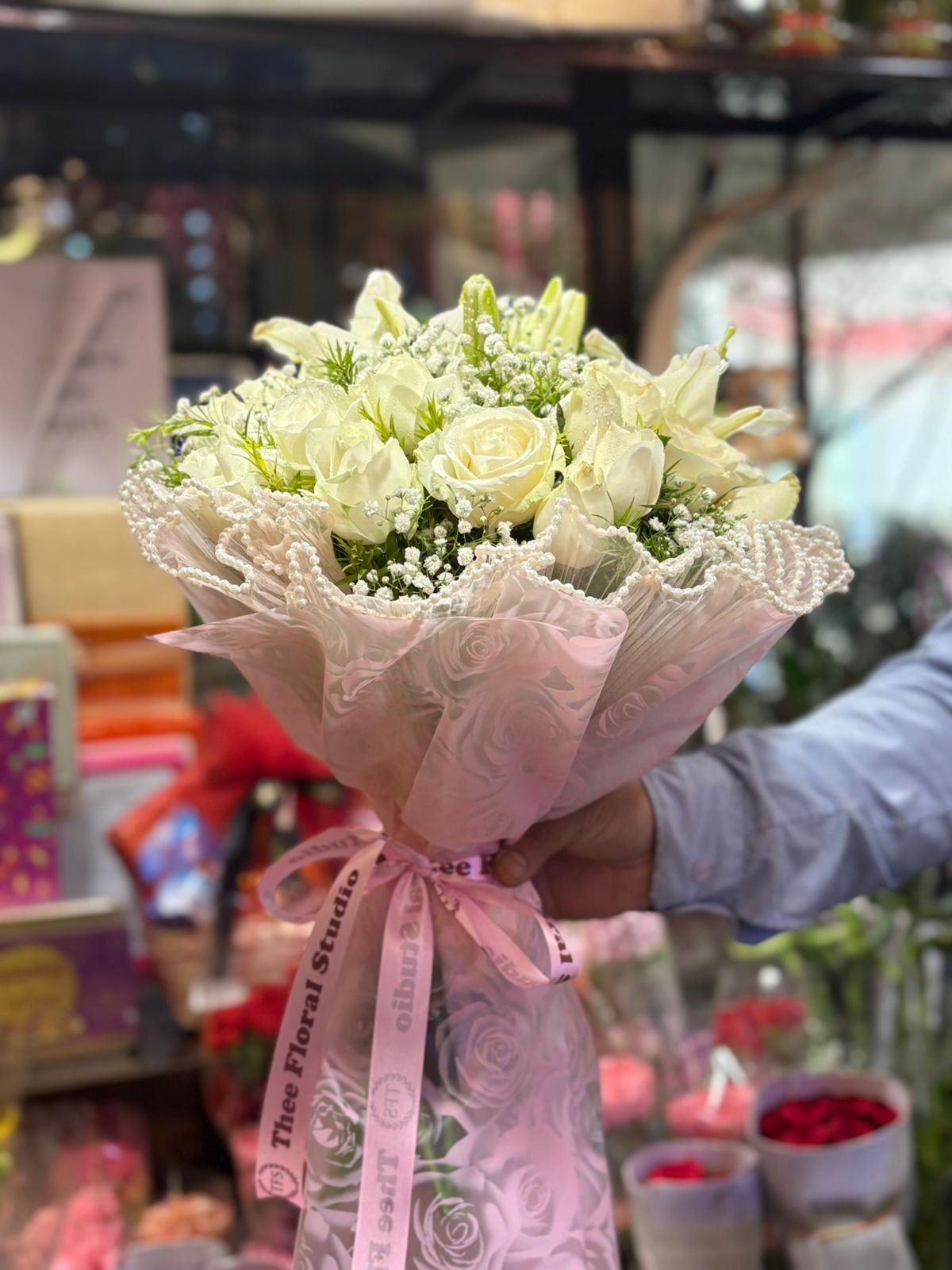 20 WHITE ROSES AND 3 STEMS OF WHITE LILIES WITHE BEAUTIFUL PEARL PACKAGING